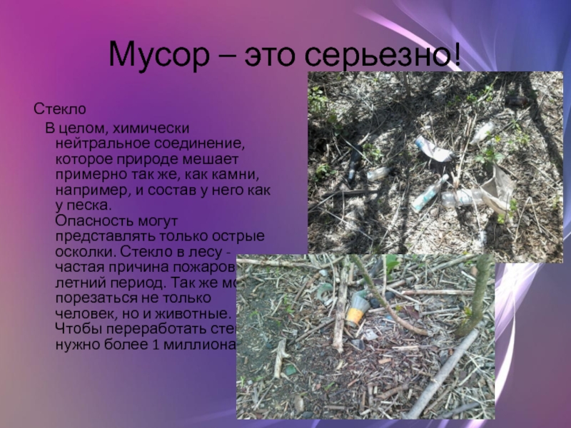 Опасность могут представлять только острые осколки. Стекло в лесу - частая причина пожаров, в летний период. Так же можно порезаться не только человек, но и животные. Чтобы переработать стекло нужно более 1 миллиона лет.