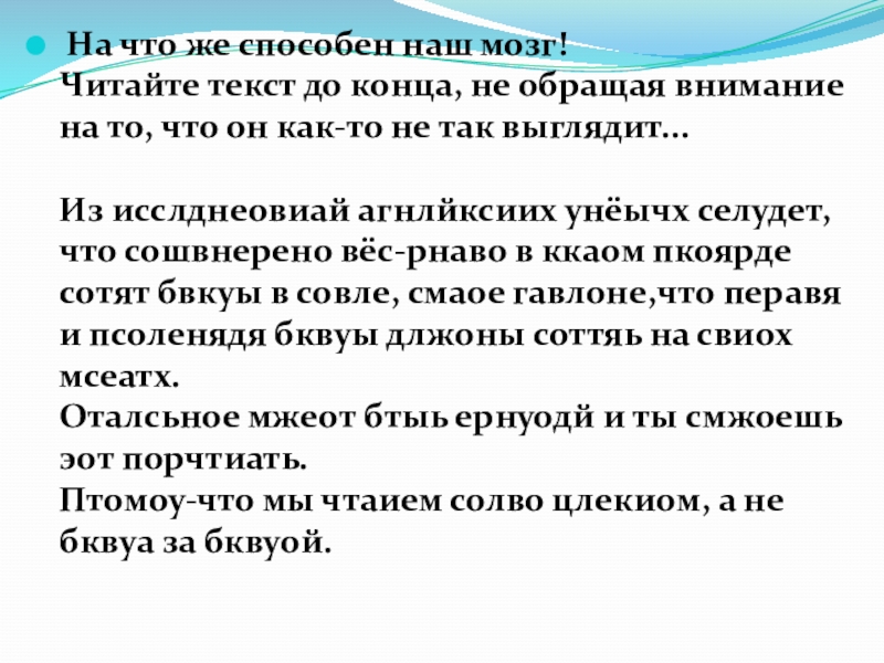 Птомоу-что мы чтаием солво цлекиом, а не бквуа за бквуой.