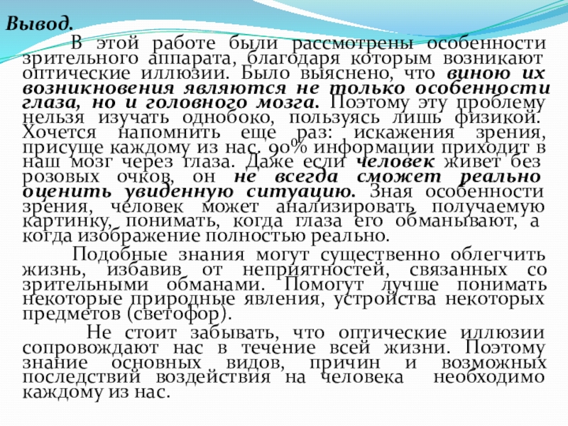 благодаря которым возникают оптические иллюзии. Было выяснено, что виною их возникновения являются не только особенности глаза, но и головного мозга. Поэтому эту проблему нельзя изучать однобоко, пользуясь лишь физикой. Хочется напомнить еще раз: искажения зрения, присуще каждому из нас. 90% информации приходит в наш мозг через глаза. Даже если человек живет без розовых очков, он не всегда сможет реально оценить увиденную ситуацию. Зная особенности зрения, человек может анализировать получаемую картинку, понимать, когда глаза его обманывают, а когда изображение полностью реально.