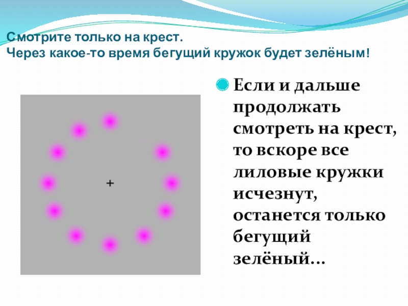 и дальше продолжать смотреть на крест, то вскоре все лиловые кружки исчезнут, останется только бегущий зелёный...