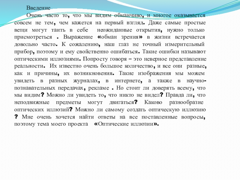 совсем не тем, чем кажется на первый взгляд. Даже самые простые вещи могут таить в себе неожиданные открытия, нужно только присмотреться . Выражение «обман зрения» в жизни встречается довольно часто. К сожалению, наш глаз не точный измерительный прибор, поэтому и ему свойственно ошибаться. Такие ошибки называют оптическими иллюзиями. Попросту говоря – это неверное представление реальности. Их известно очень большое количество, и все они разные, как и причины, их возникновения. Такие изображения мы можем увидеть в разных журналах, в интернете, а также в научно-познавательных передачах, рекламе . Но стоит ли доверять всему, что мы видим? Можно ли увидеть то, что никто не видел? Правда ли, что неподвижные предметы могут двигаться? Каково разнообразие оптических иллюзий? Можно ли самому создать оптическую иллюзию ? Мне очень хочется найти ответы на все поставленные вопросы, поэтому тема моего проекта «Оптические иллюзии».