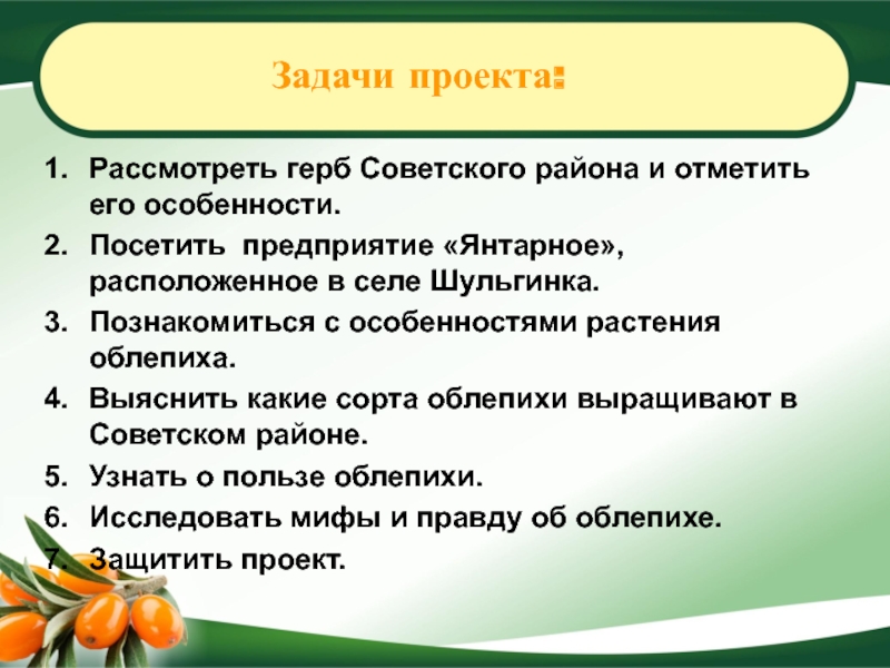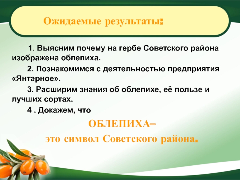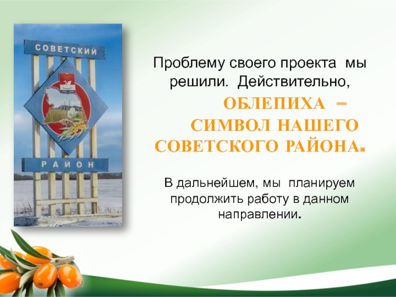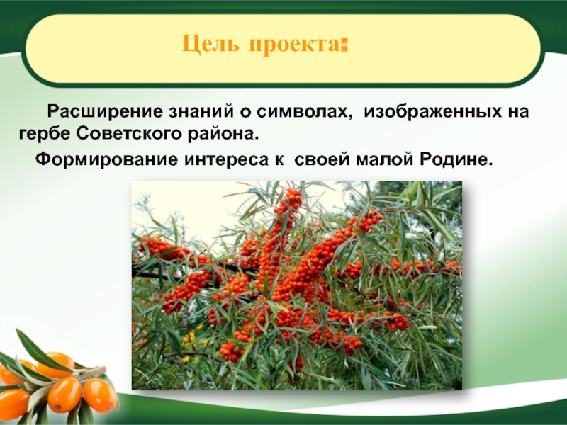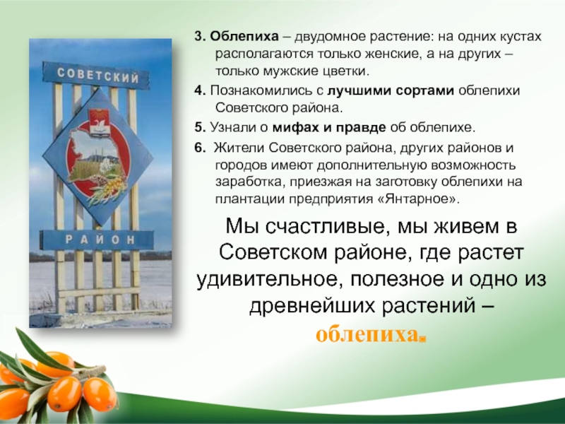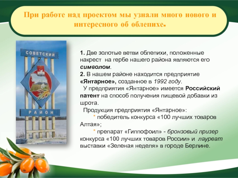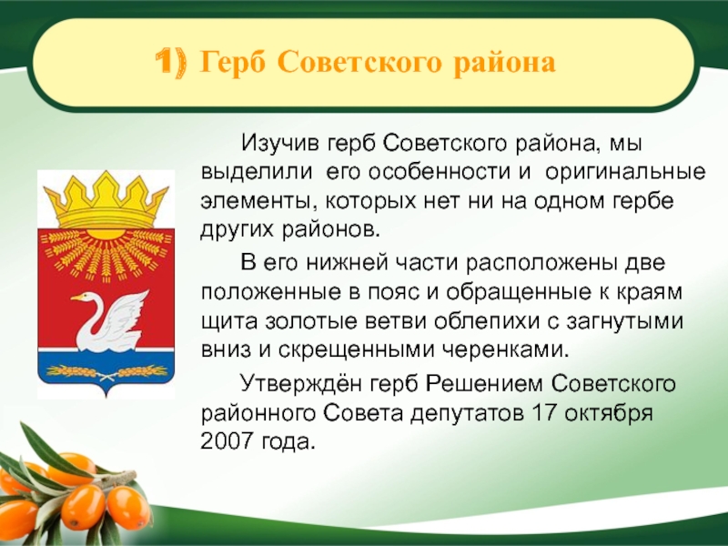 1. Две золотые ветви облепихи, положенные накрест на гербе нашего района являются его символом.