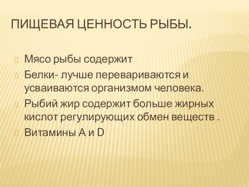 ПИЩЕВАЯ ЦЕННОСТЬ РЫБЫ.Мясо рыбы содержитБелки- лучше перевариваются и усваиваются организмом человека.Рыбий жир содержит больше жирных кислот регулирующих