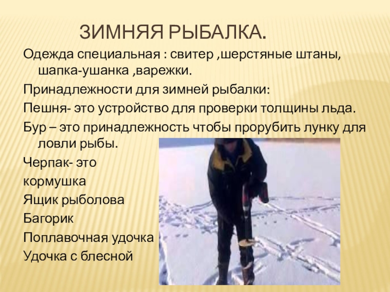 ЗИМНЯЯ РЫБАЛКА.Одежда специальная : свитер ,шерстяные штаны, шапка-ушанка ,варежки.Принадлежности для зимней рыбалки:Пешня- это устройство для проверки толщины
