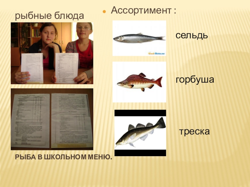 РЫБА В ШКОЛЬНОМ МЕНЮ.Ассортимент :рыбные блюдасельдьгорбушатреска