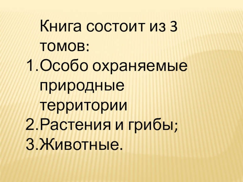 Книга состоит из 3 томов:Особо охраняемые природные территорииРастения и грибы;Животные.