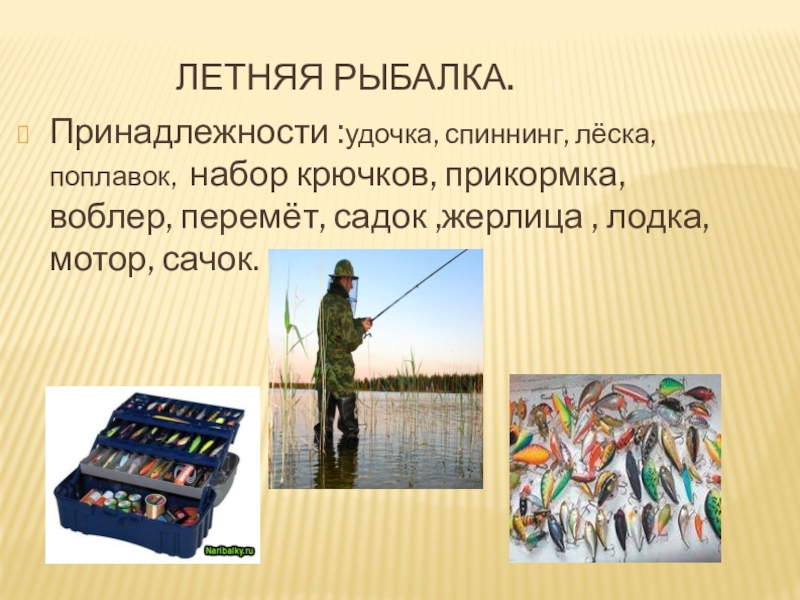 ЛЕТНЯЯ РЫБАЛКА.Принадлежности :удочка, спиннинг, лёска, поплавок, набор крючков, прикормка, воблер, перемёт, садок ,жерлица , лодка, мотор, сачок.