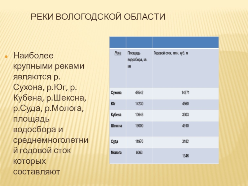 РЕКИ ВОЛОГОДСКОЙ ОБЛАСТИНаиболее крупными реками являются р.Сухона, р.Юг, р.Кубена, р.Шексна, р.Суда, р.Молога, площадь водосбора и среднемноголетний годовой