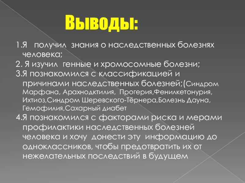 Я познакомился с факторами риска и мерами профилактики наследственных болезней человека и хочу донести эту информацию до одноклассников, чтобы предотвратить их от нежелательных последствий в будущем