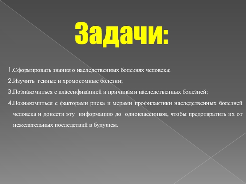 Познакомиться с факторами риска и мерами профилактики наследственных болезней человека и донести эту информацию до одноклассников, чтобы предотвратить их от нежелательных последствий в будущем.