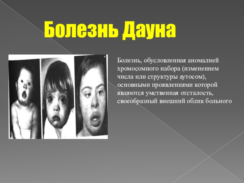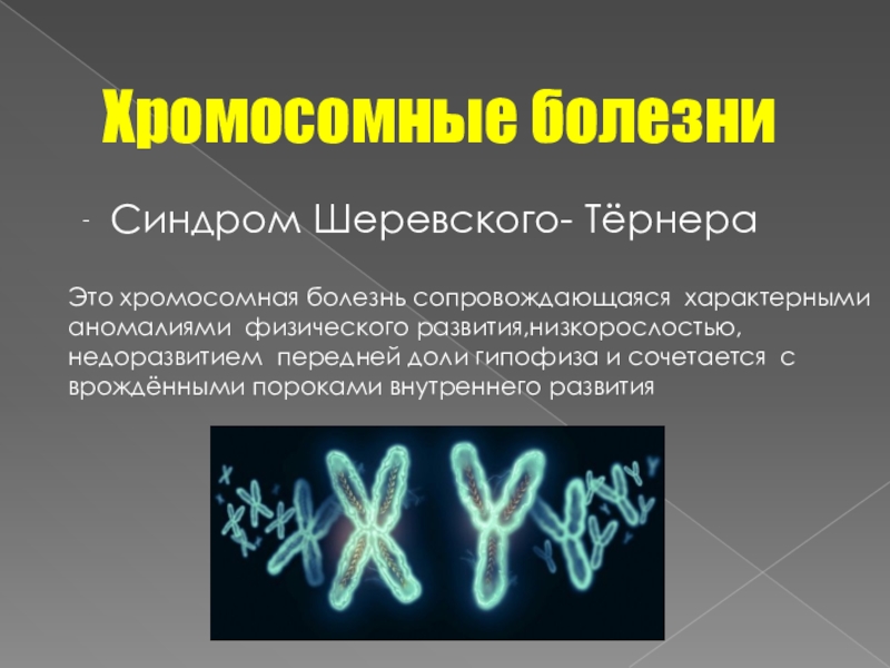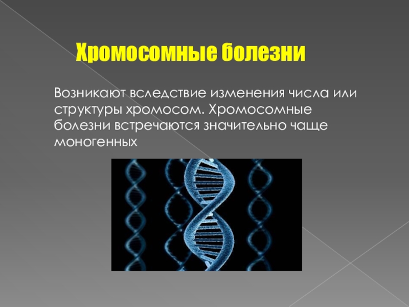Возникают вследствие изменения числа или структуры хромосом. Хромосомные болезни встречаются