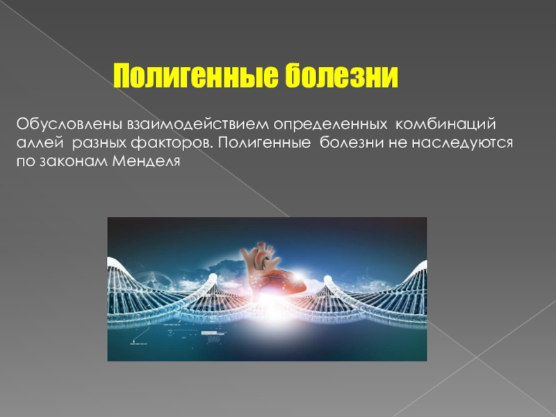 Обусловлены взаимодействием определенных комбинаций аллей разных факторов. Полигенные болезни не