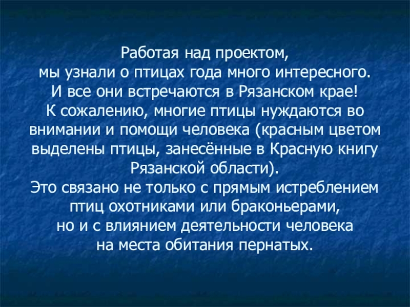 К сожалению, многие птицы нуждаются во внимании и помощи человека (красным цветом выделены птицы, занесённые в Красную книгу Рязанской области).