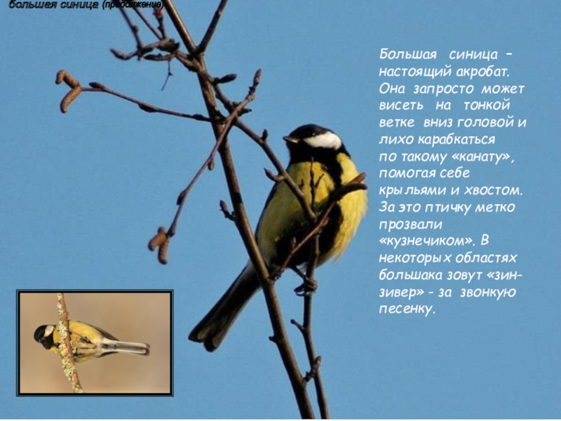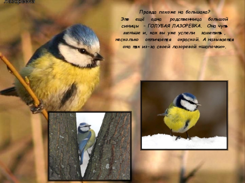 Название «синица» нисколько не относится к окраске. В оперении синиц вообще нет синих оттенков, а имя