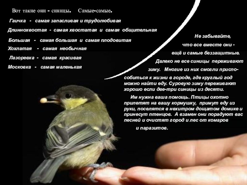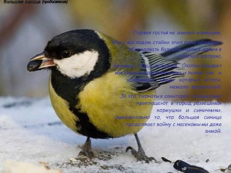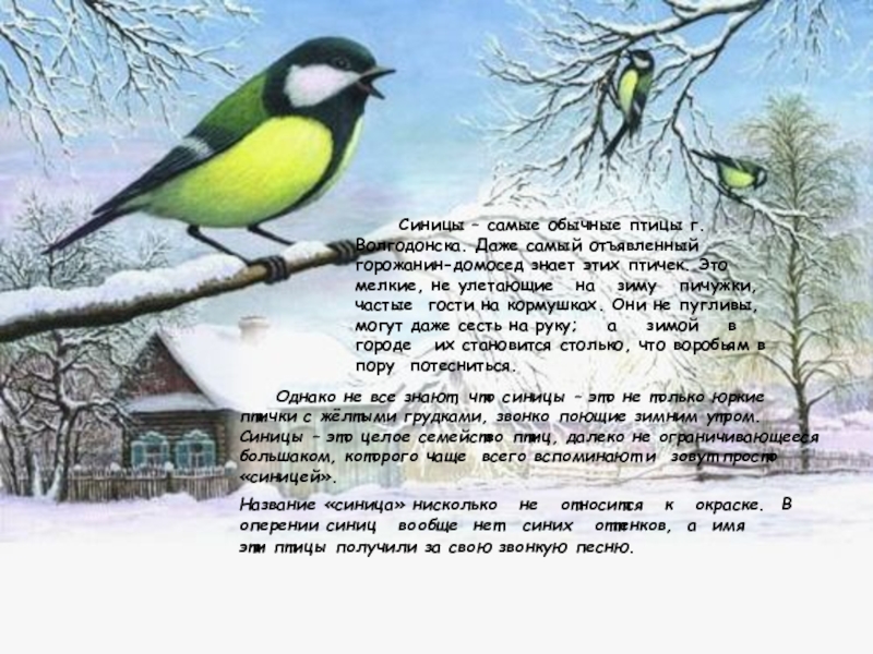 собиться к жизни в городе, где круглый год можно найти еду. Суровую зиму переживают хорошо если две-три синицы из десяти.