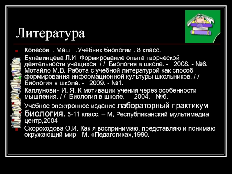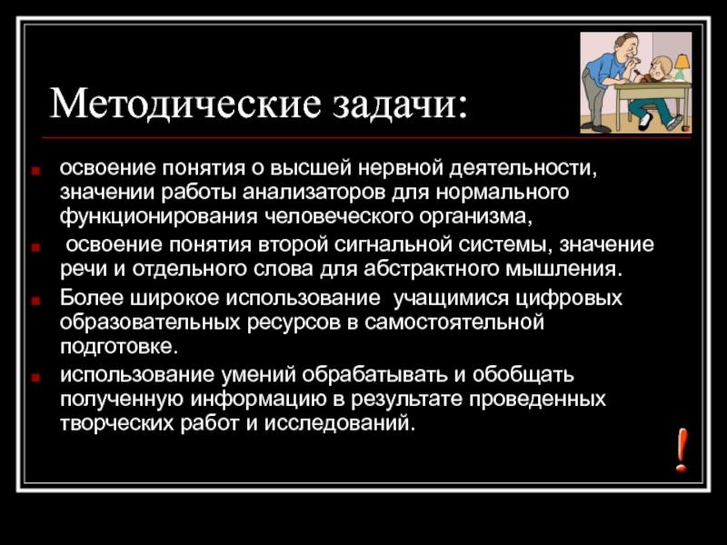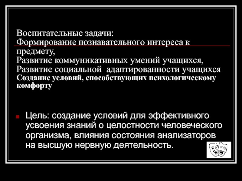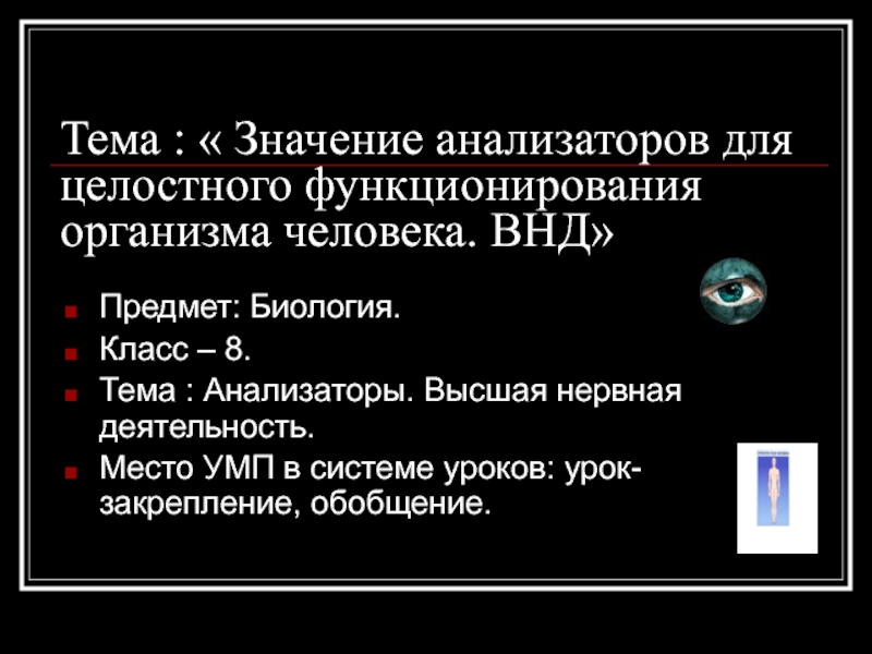 Цель: создание условий для эффективного усвоения знаний о целостности человеческого организма, влияния состояния анализаторов на высшую нервную деятельность.