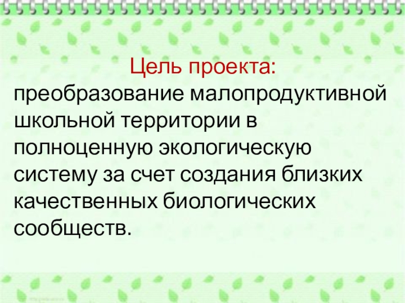 Цель проекта: преобразование малопродуктивной школьной территории в полноценную экологическую систему за счет создания близких качественных биологических сообществ.