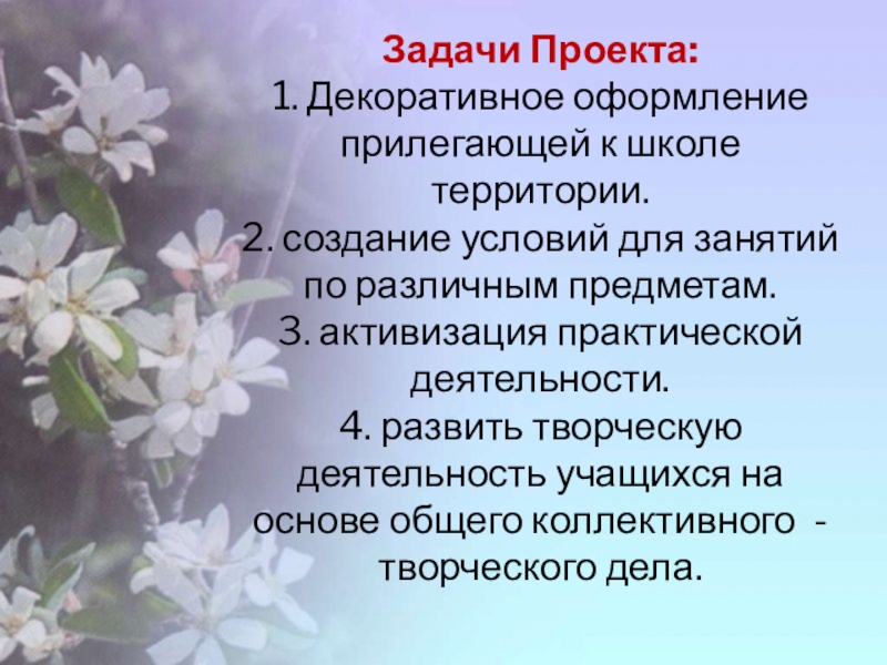 Слайд 3Задачи Проекта: 1. Декоративное оформление прилегающей к школе территории. 2. создание условий для