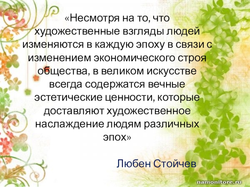 в связи с изменением экономического строя общества, в великом искусстве всегда содержатся вечные эстетические ценности, которые доставляют художественное наслаждение людям различных эпох» Любен Стойчев