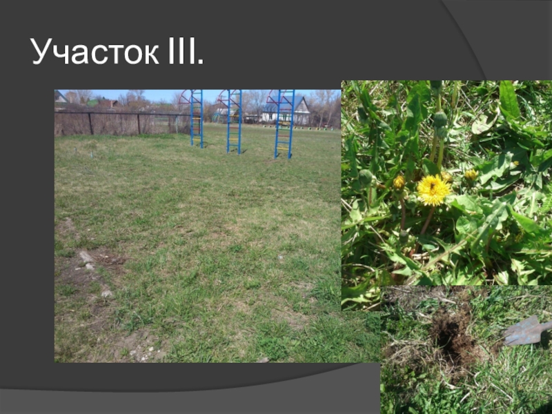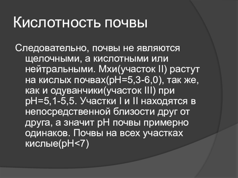 II) растут на кислых почвах(pH=5,3-6,0), так же, как и одуванчики(участок III) при pH=5,1-5,5. Участки I и II находятся в непосредственной близости друг от друга, а значит pH почвы примерно одинаков. Почвы на всех участках кислые(pH<7)