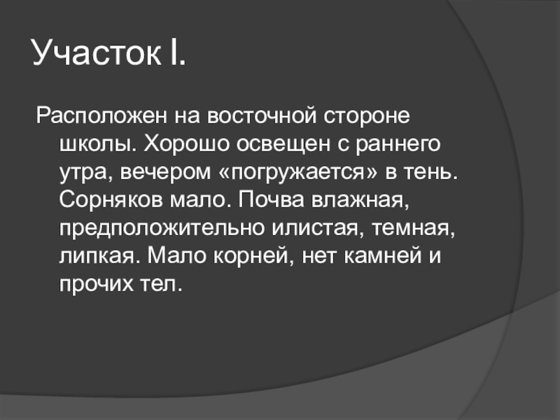 вечером «погружается» в тень. Сорняков мало. Почва влажная, предположительно илистая, темная, липкая. Мало корней, нет камней и прочих тел.