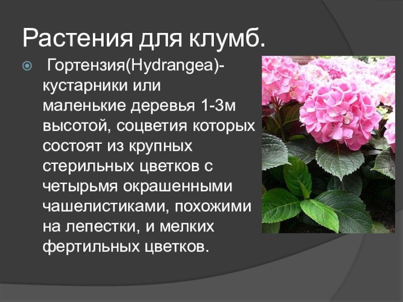 Гортензия(Hydrangea)-кустарники или маленькие деревья 1-3м высотой, соцветия которых состоят из крупных стерильных цветков