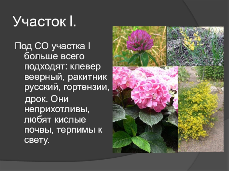 Под СО участка I больше всего подходят: клевер веерный, ракитник