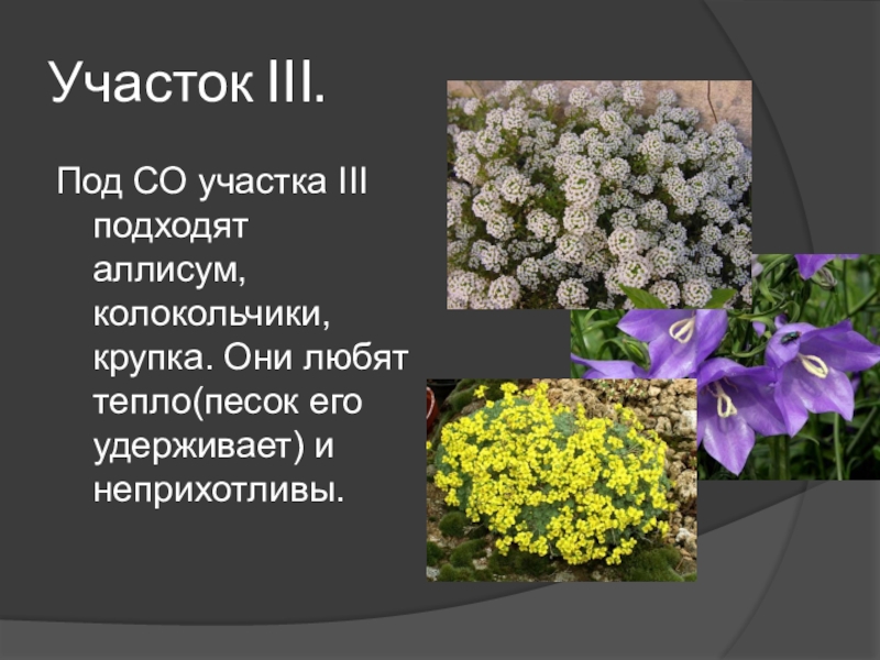 Под СО участка III подходят аллисум, колокольчики, крупка. Они любят