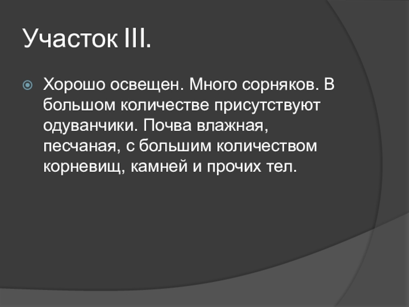 Хорошо освещен. Много сорняков. В большом количестве присутствуют одуванчики. Почва