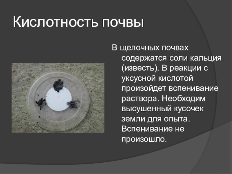 кислотой произойдет вспенивание раствора. Необходим высушенный кусочек земли для опыта. Вспенивание не произошло.