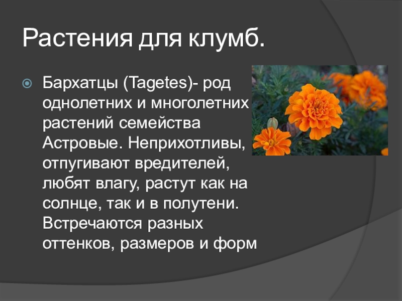 Бархатцы (Tagetes)- род однолетних и многолетних растений семейства Астровые.