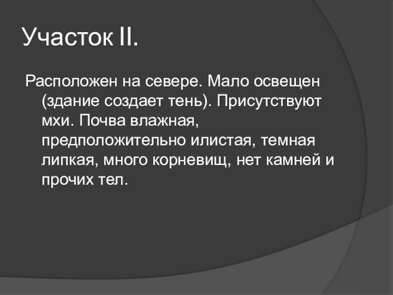 Расположен на севере. Мало освещен(здание создает тень). Присутствуют мхи. Почва