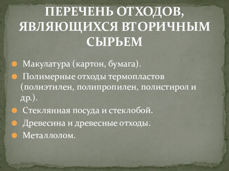 ПЕРЕЧЕНЬ ОТХОДОВ, ЯВЛЯЮЩИХСЯ ВТОРИЧНЫМ СЫРЬЕМ