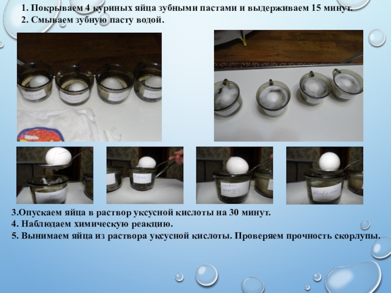 1. Покрываем 4 куриных яйца зубными пастами и выдерживаем 15 минут.