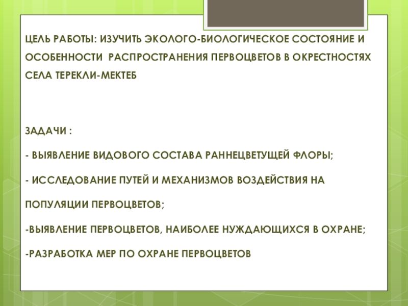 Цель работы: изучить эколого-биологическое состояние и особенности распространения первоцветов в окрестностях села Терекли-Мектеб Задачи :- выявление видового