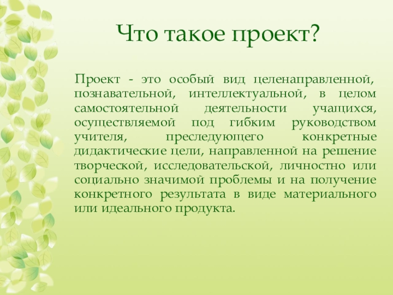 целом самостоятельной деятельности учащихся, осуществляемой под гибким руководством учителя, преследующего конкретные дидактические цели, направленной на решение творческой, исследовательской, личностно или социально значимой проблемы и на получение конкретного результата в виде материального или идеального продукта.