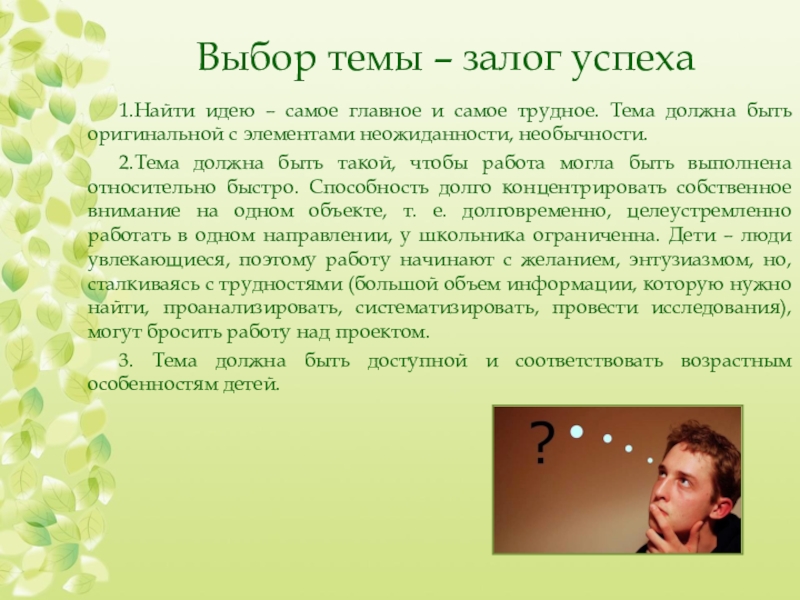 Слайд 13Выбор темы – залог успеха