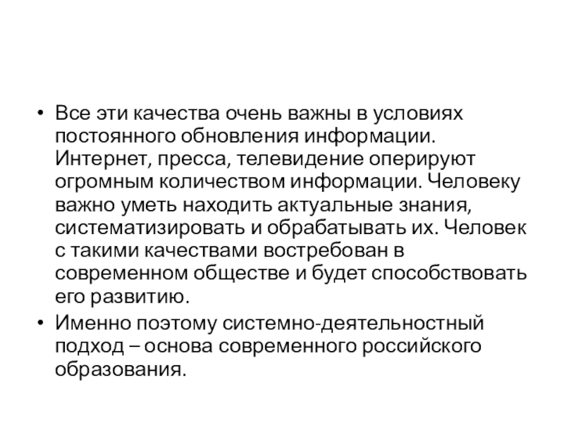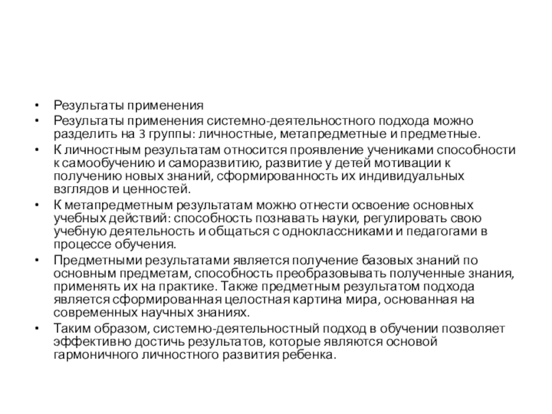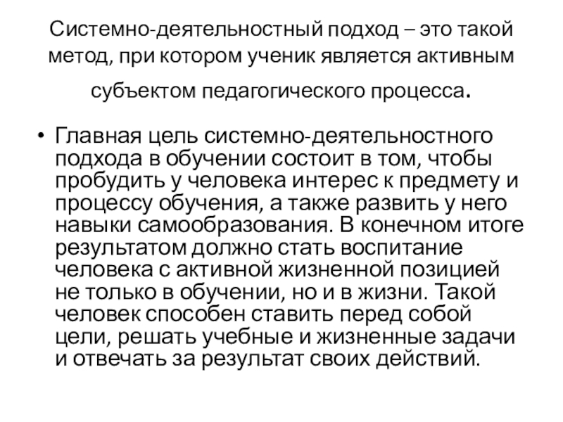 Главная цель системно-деятельностного подхода в обучении состоит в том, чтобы пробудить у человека интерес к предмету и процессу обучения, а также развить у него навыки самообразования. В конечном итоге результатом должно стать воспитание человека с активной жизненной позицией не только в обучении, но и в жизни. Такой человек способен ставить перед собой цели, решать учебные и жизненные задачи и отвечать за результат своих действий.