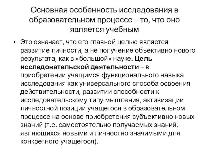 Это означает, что его главной целью является развитие личности, а не получение объективно нового результата, как в «большой» науке. Цель исследовательской деятельности – в приобретении учащимся функционального навыка исследования как универсального способа освоения действительности, развитии способности к исследовательскому типу мышления, активизации личностной позиции учащегося в образовательном процессе на основе приобретения субъективно новых знаний (т.е. самостоятельно получаемых знаний, являющихся новыми и личностно значимыми для конкретного учащегося).