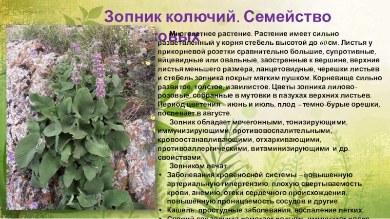 Зопник обладает мочегонными, тонизирующими, иммунизирующими, противовоспалительными, кровоостанавливающими, отхаркивающими, противоаллергическими, витаминизирующими и др. свойствами.