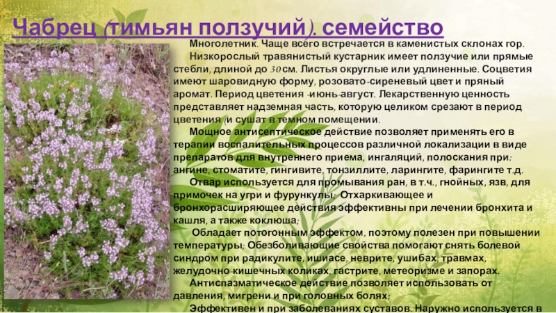 Слайд 8Чабрец (тимьян ползучий). семейство Яснотковые