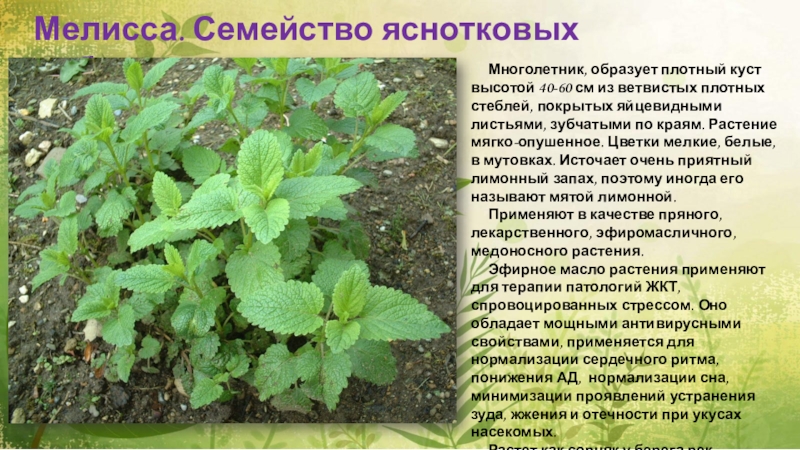 Слайд 4Мелисса. Семейство яснотковых (губоцветных).