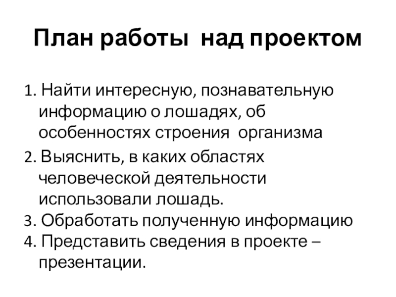 План работы над проектом	1. Найти интересную, познавательную информацию о лошадях, об особенностях строения организма2. Выяснить, в каких
