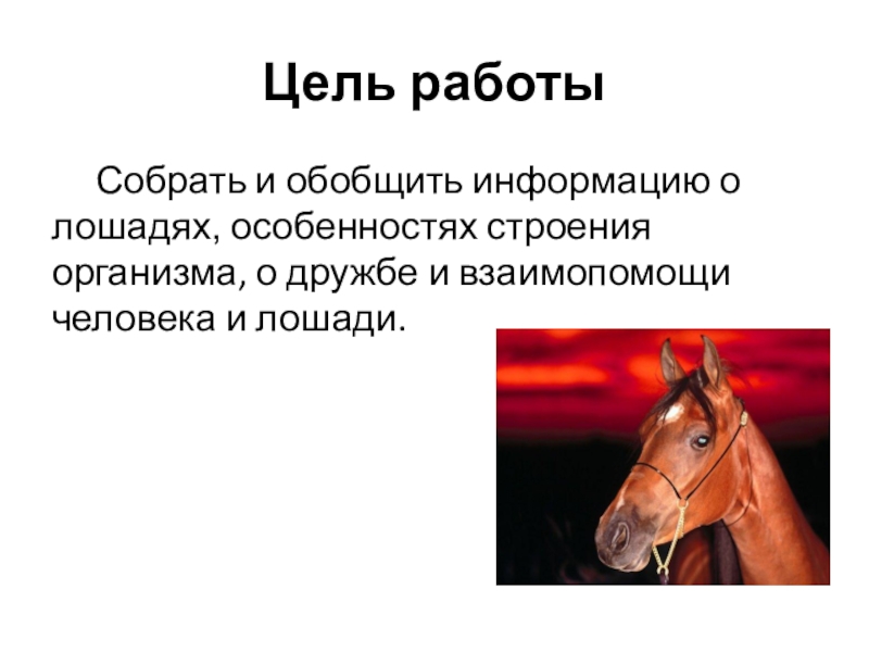 Цель работы Собрать и обобщить информацию о лошадях, особенностях строения организма, о дружбе и взаимопомощи человека и лошади.