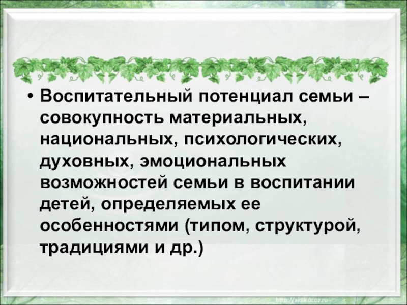 Слайд 6Воспитательный потенциал семьи – совокупность материальных, национальных, психологических, духовных, эмоциональных возможностей