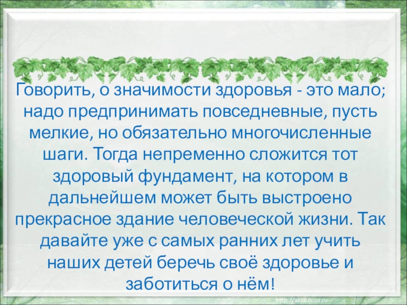 Слайд 31Говорить, о значимости здоровья - это мало; надо предпринимать повседневные, пусть