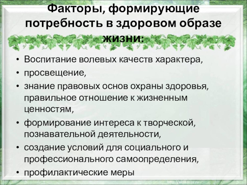 Слайд 13Факторы, формирующие потребность в здоровом образе жизни: