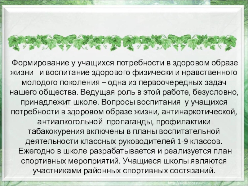 здорового физически и нравственного молодого поколения – одна из первоочередных задач нашего общества. Ведущая роль в этой работе, безусловно, принадлежит школе. Вопросы воспитания у учащихся потребности в здоровом образе жизни, антинаркотической, антиалкогольной пропаганды, профилактики табакокурения включены в планы воспитательной деятельности классных руководителей 1-9 классов.