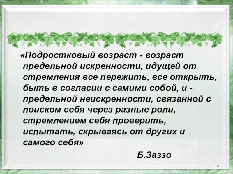 Слайд 14 «Подростковый возраст - возраст предельной искренности, идущей от стремления все