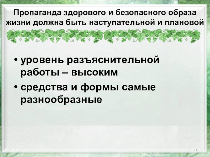 Слайд 16Пропаганда здорового и безопасного образа жизни должна быть наступательной и плановой